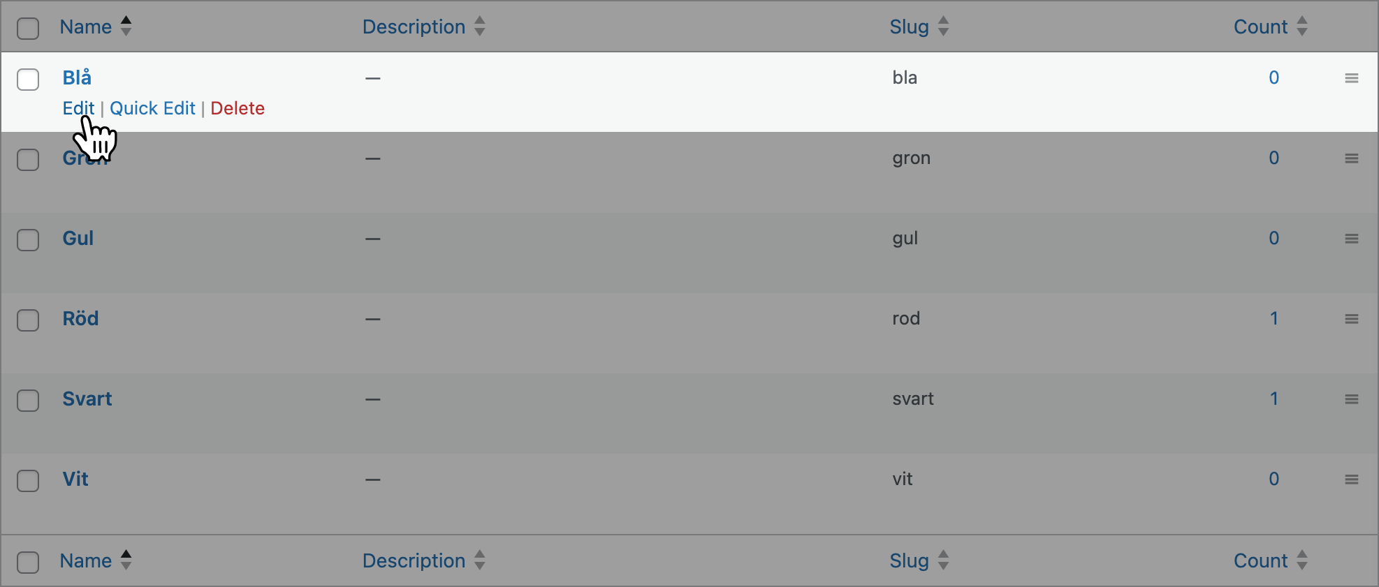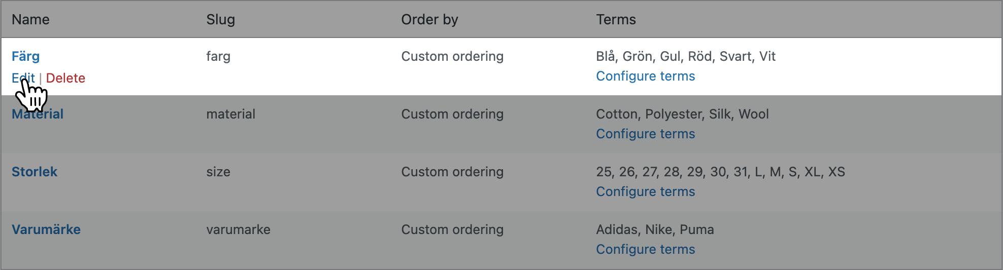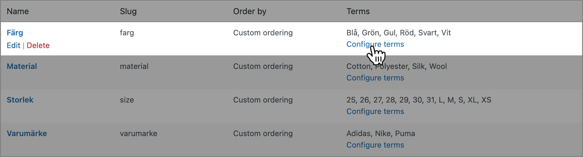 Här klickar vi på Konfigurera termer som står under dina attributs termer.