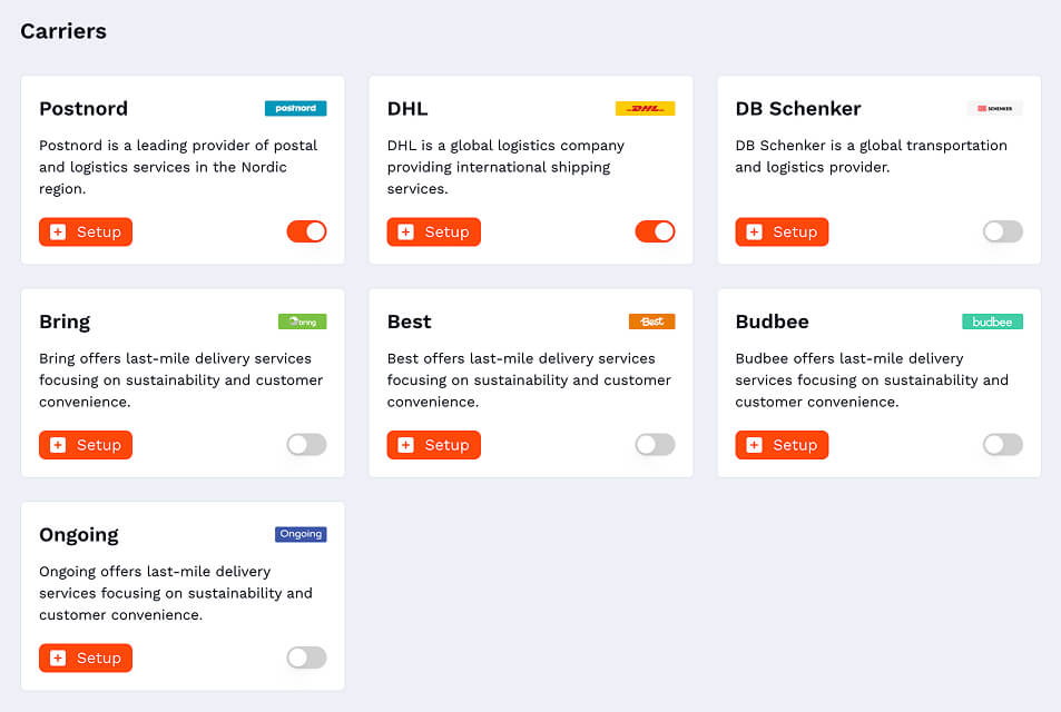 - Gå till Inställningar → Transportörer och klicka på Konfigurera på den transportör som du vill koppla på.