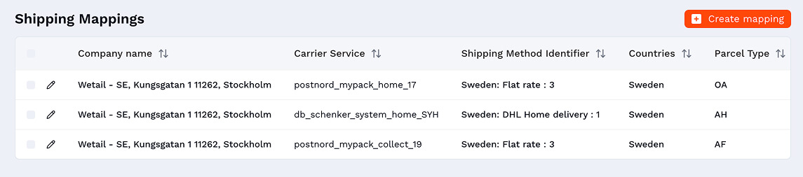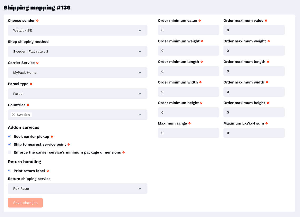 - Här mappar du upp din butiks fraktsätt med en transportörs fraktmetoder. Du kan även ange avanacerade inställningar i din mappning som min/max vikt, dimensioner o.s.v.
