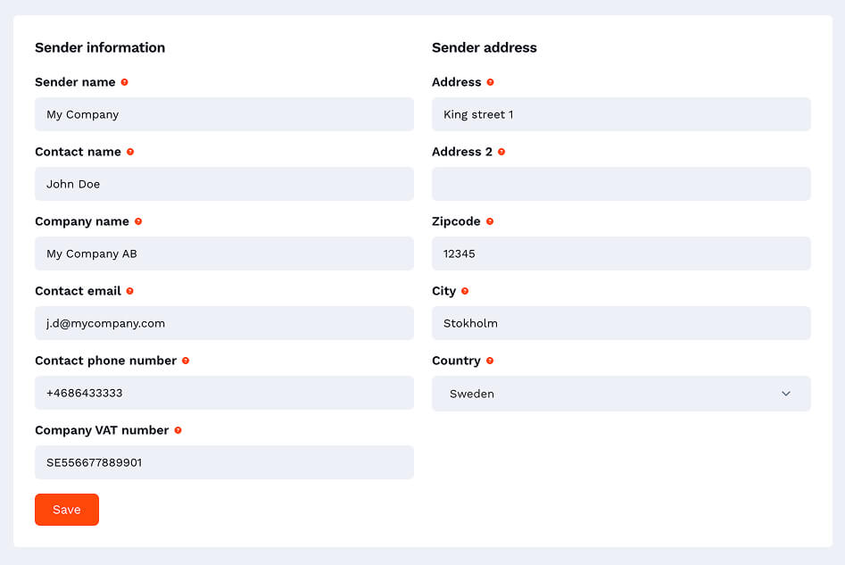 Dina avsändare är den plats där transportören ska hämta upp dina leveranser. Du kan ha fler upphämtningsställen som du kan matcha upp i systemet.