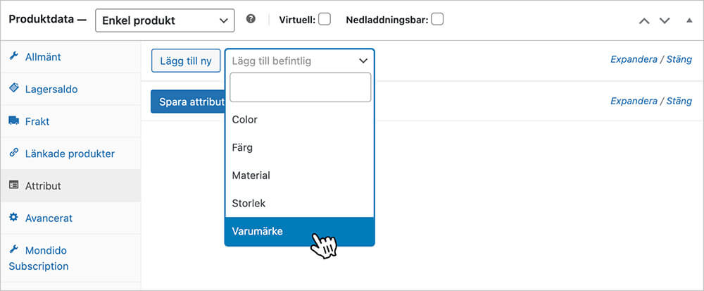 Navigera till en av dina produkter i admin och skrolla ner till Produktdata där du lägger till attributet Varumärken