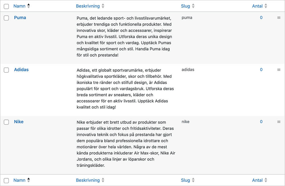 Under kolumnen Antal ser du antagligen nu en 0:a för varje varumärkes-rad, detta indikerar att du inte lagt till dina varumärken på dina produkter.