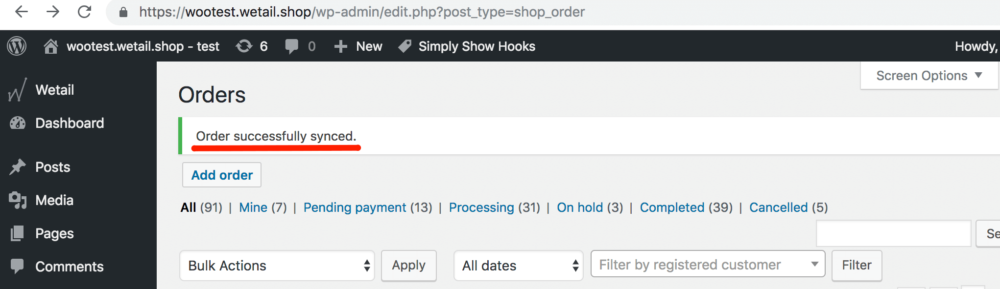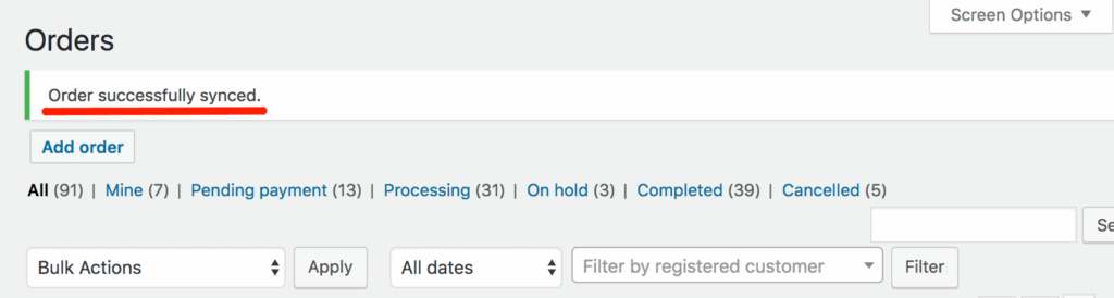 - Säkerställ att ordern synkroniseras och du får detta meddelande (se nedan)
