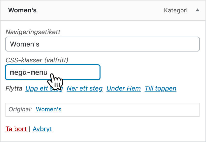Skrolla ner till menylänken som ska fälla ut en megameny och fäll ut panelen.Skriv in klassen mega-menu under CSS-Klasser.
