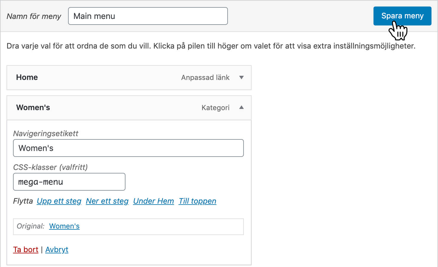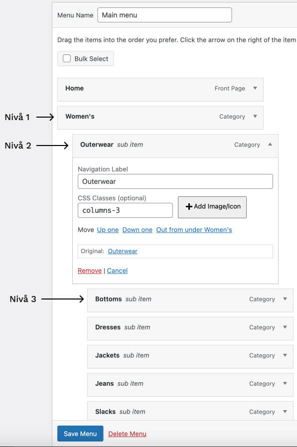 För att skapa en snygg megameny i ditt tema ska du bara skriva in en klass i förälderlänken. Följ guiden nedan.