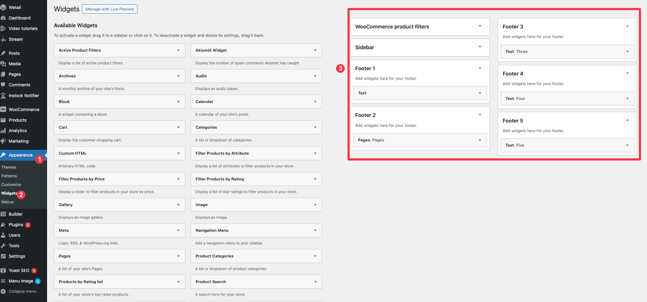 • Dra och släpp de önskade widgetarna till de olika kolumnerna i footern.