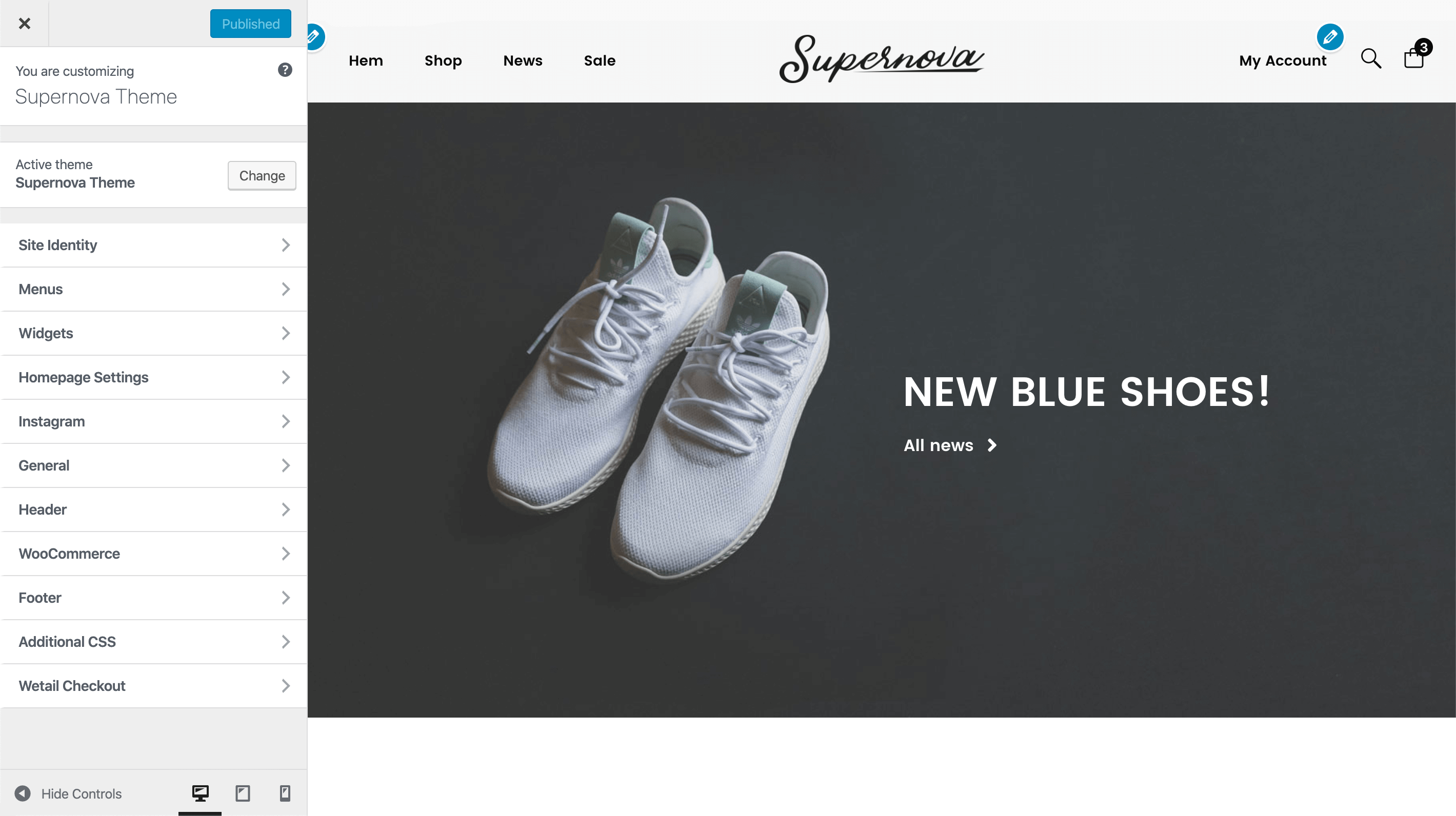 För att anpassa temat delas inställningarna in i olika sektioner. T.ex hanterar du headerns design under fliken Header och butikens inställningar under WooCommerce. Kika på filmen här nedan för att få en snabb introduktion.