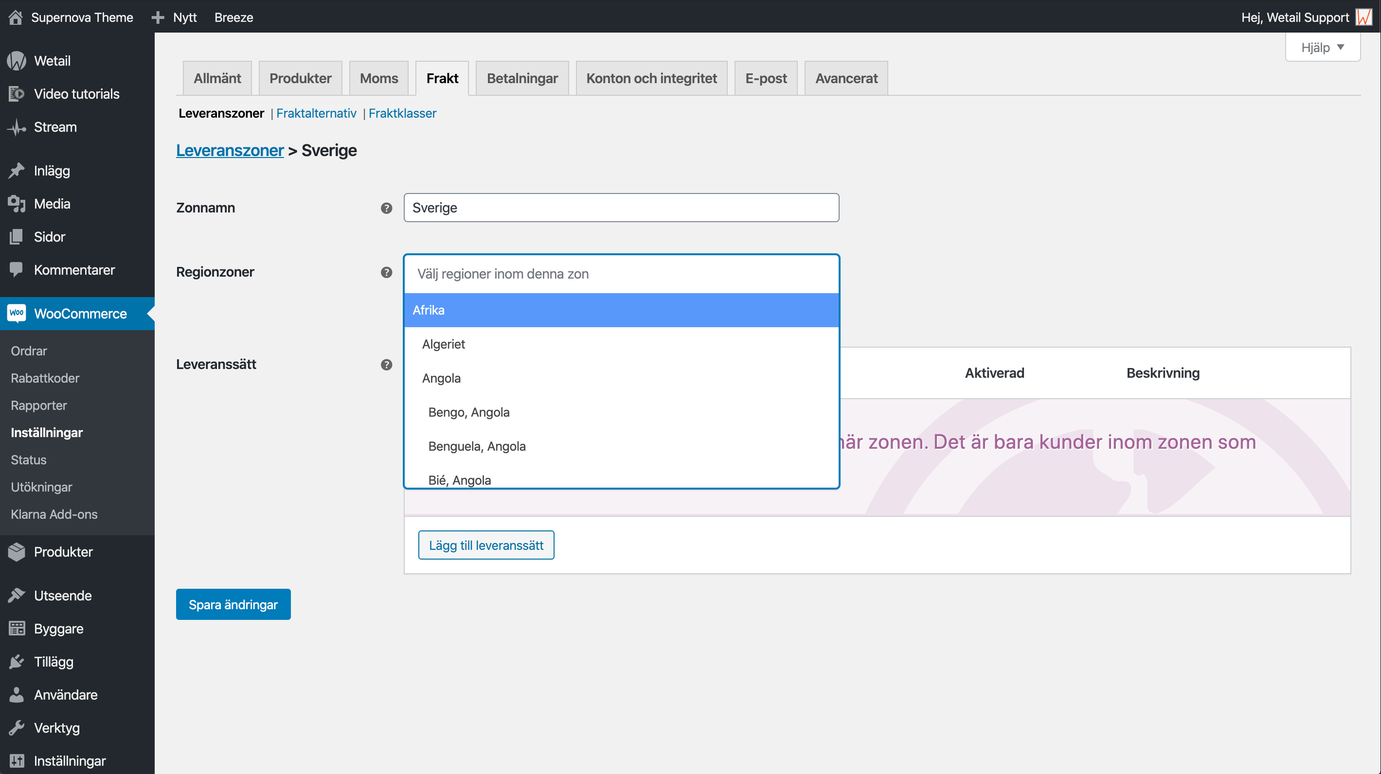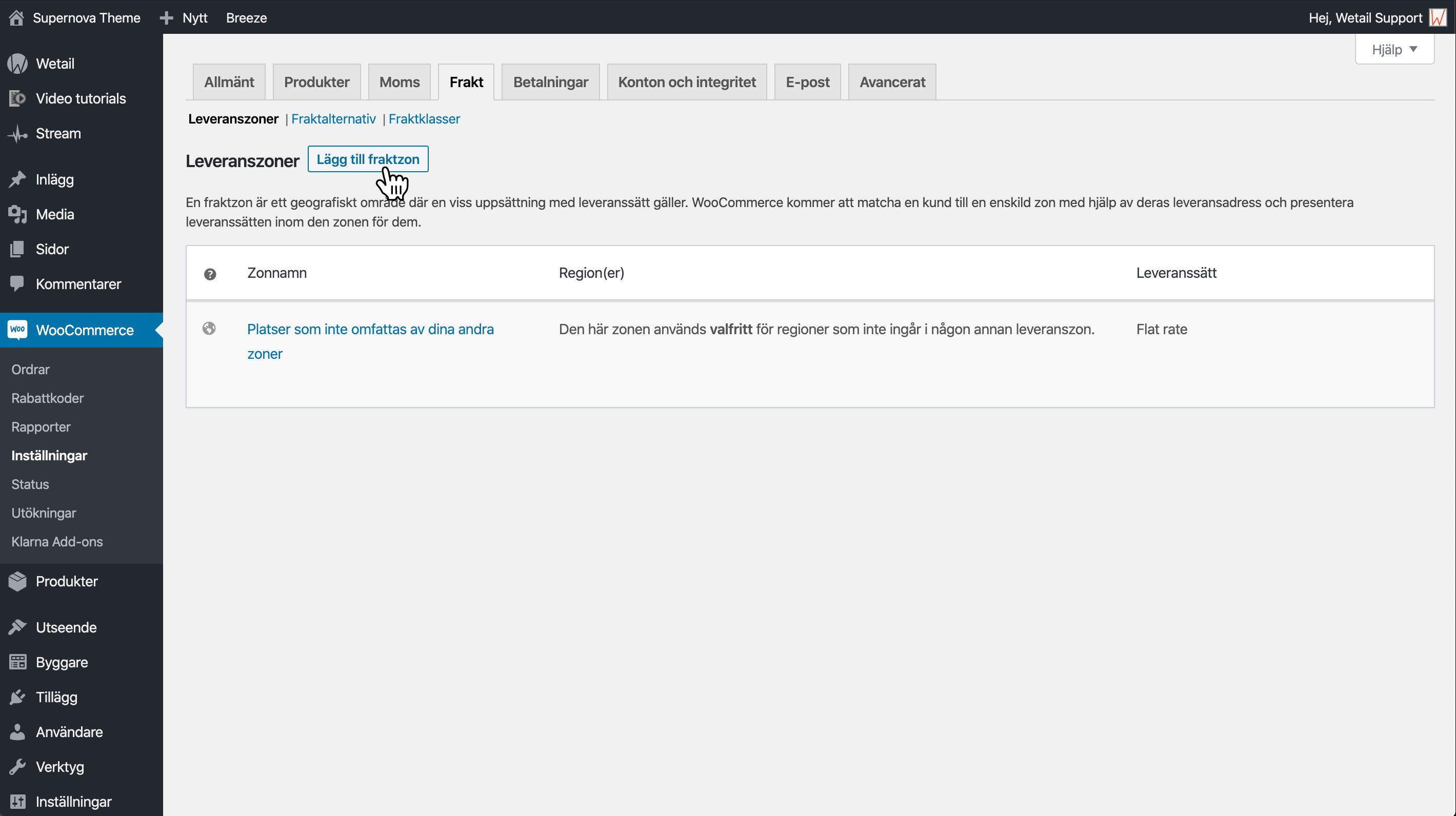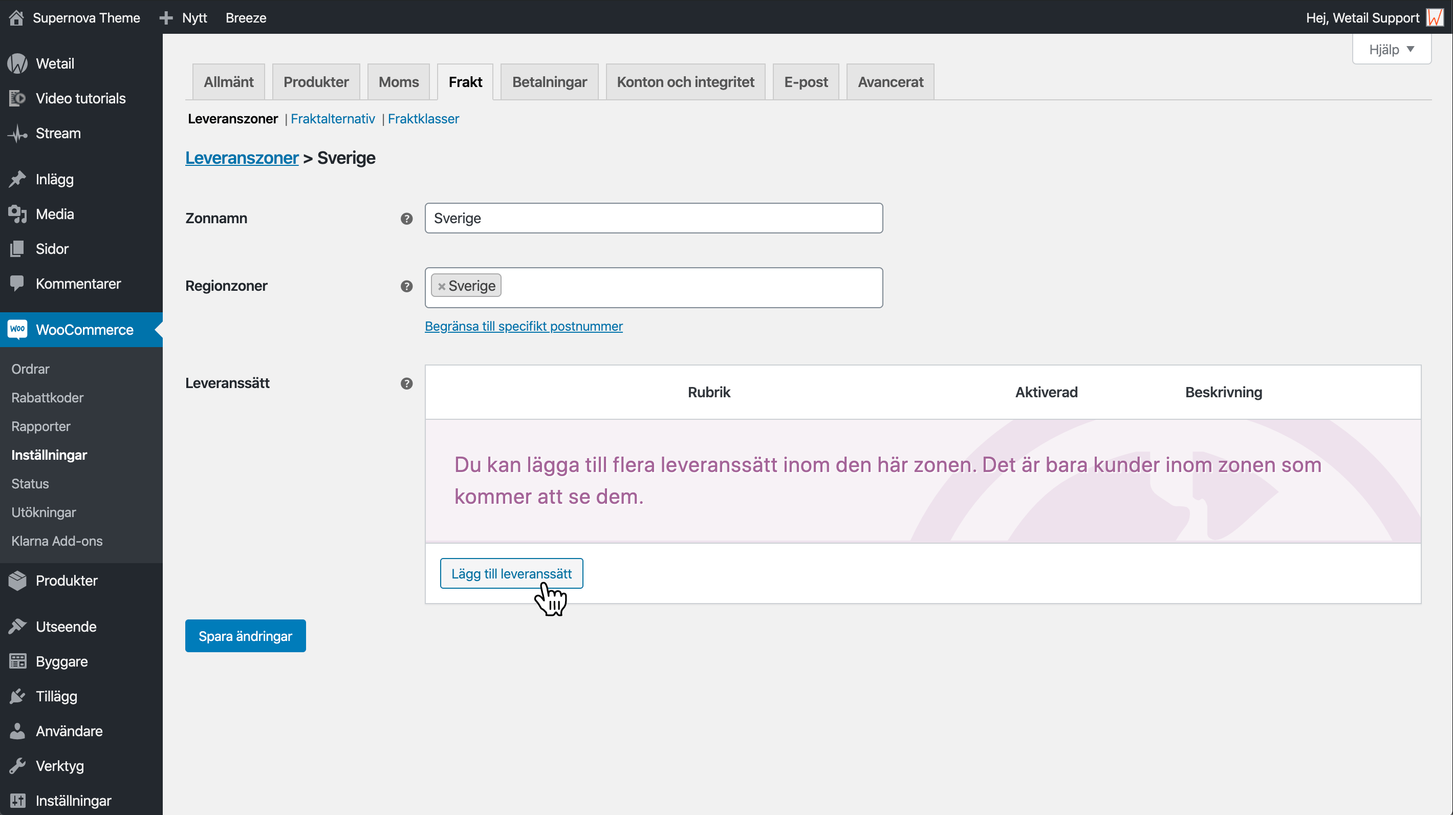 För att lägga till leveranssätt måste du först lägga till fraktzoner. Fraktzoner är geografiska zoner som hanterar dina fraktsätt och fraktpriserna per zon. Ofta delas zoner in i länder eller regioner, men det går även att dela upp på postnummer-områden.