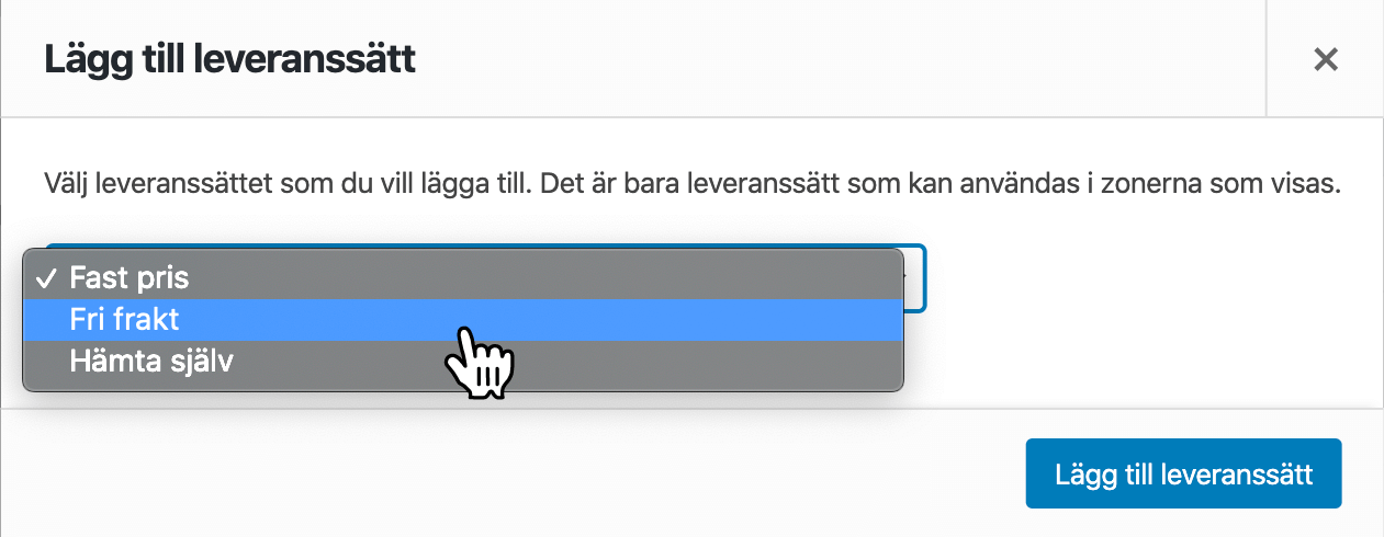 Välj Fri frakt i select-menyn i popup-fönstret och klicka på Lägg till leveranssätt