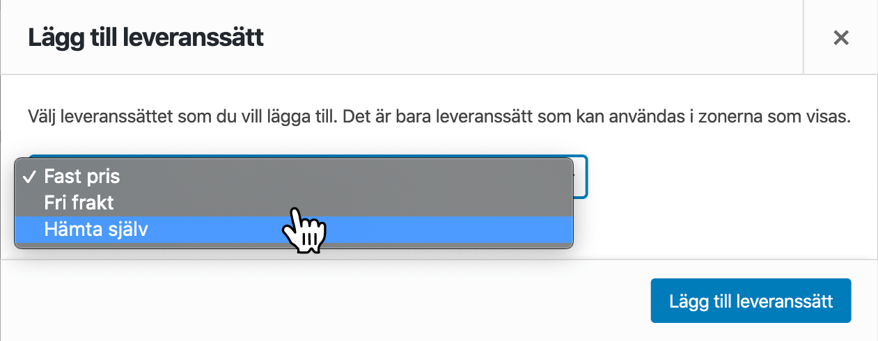 Välj Hämta själv i select-menyn i popup-fönstret och klicka på Lägg till leveranssätt