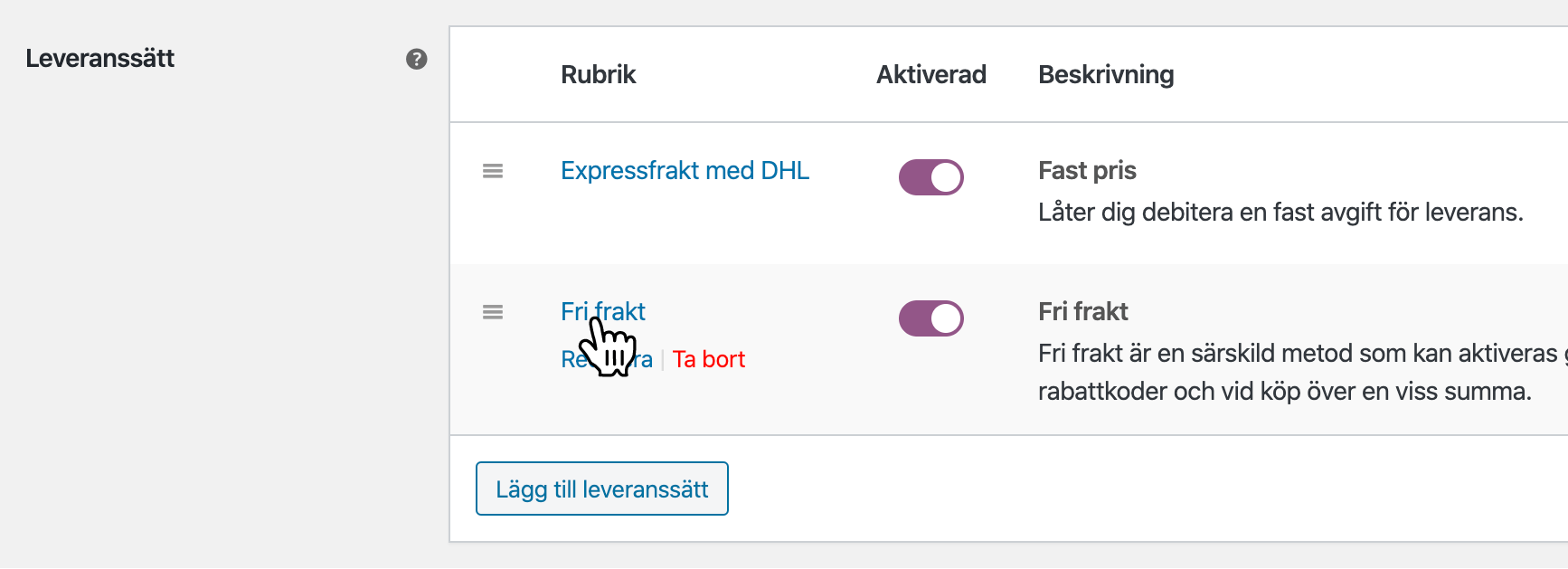 WooCommerce stödjer tre fraktsätt: Fast pris, Fri frakt och Hämta själv. Om du har flera olika fraktsätt med samma pris kopplat till sig så lägger du upp separata Fast pris-frakter för varje alternativ.