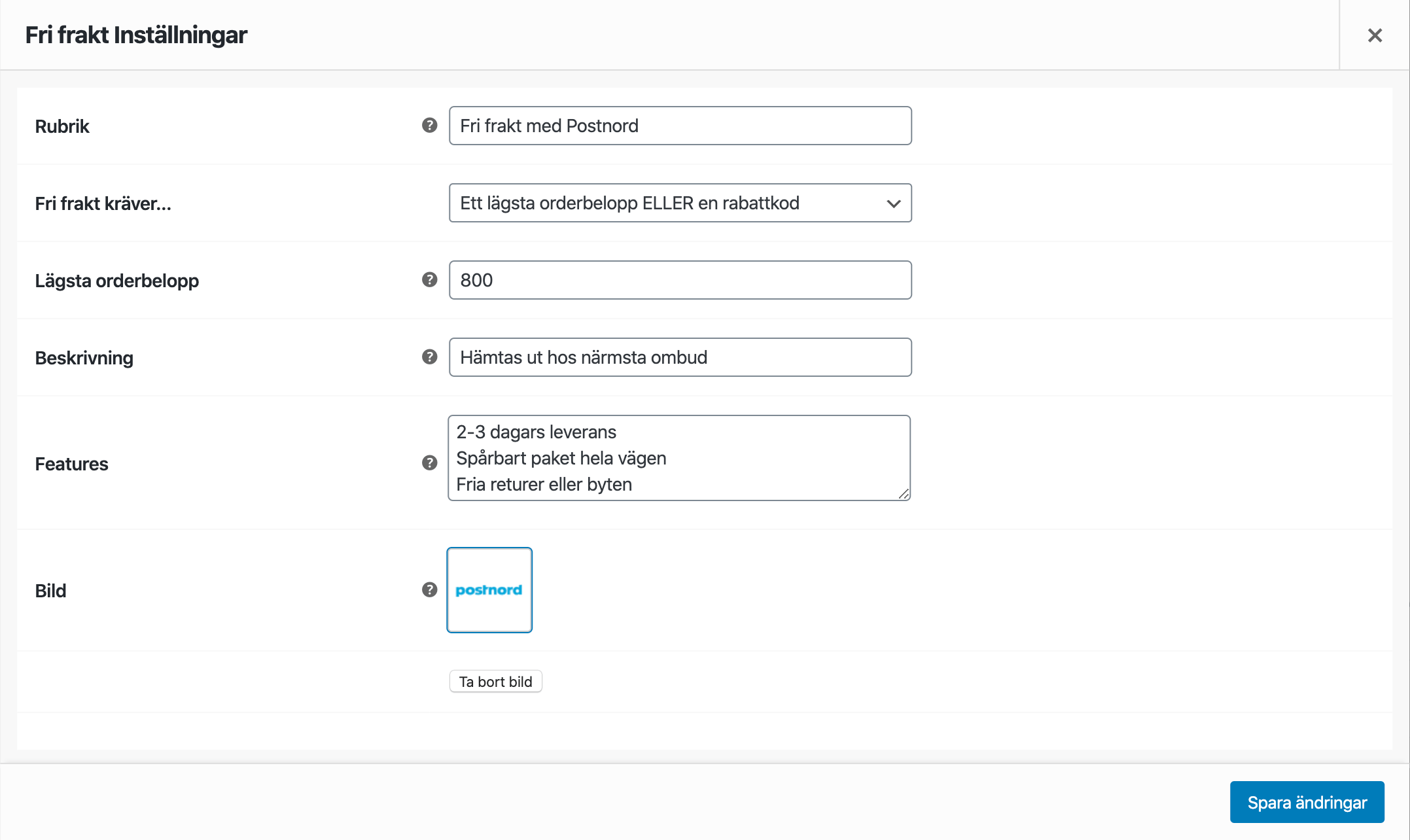 Lägsta orderbelopp: Skriv in varukorgens lägsta orderbelopp för att kunden ska kunna tillgodses fri frakt.