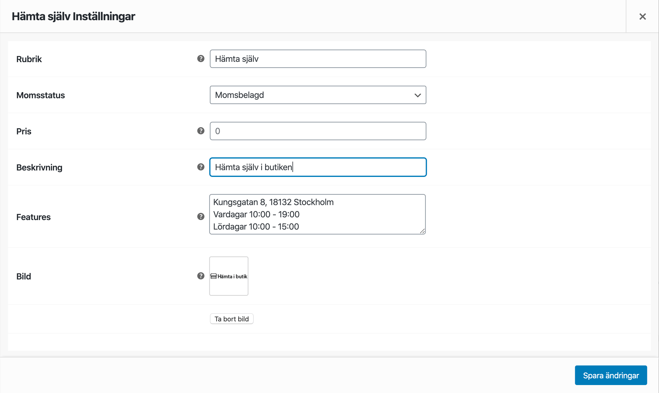 Features: Lägg in adress och öppettider till er butik eller upphämtningställe.