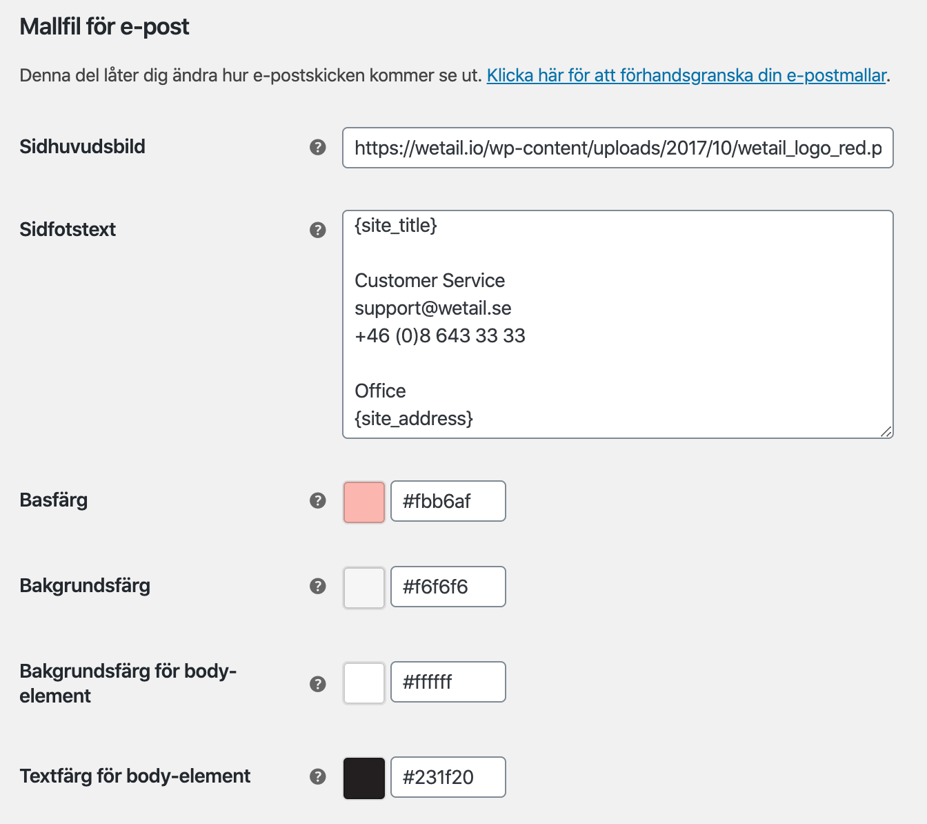 | Bakgrundsfärg på body-element: | All text i mailet ligger i en box. Här ställer du in bakgrundsfärgen på den boxen. |