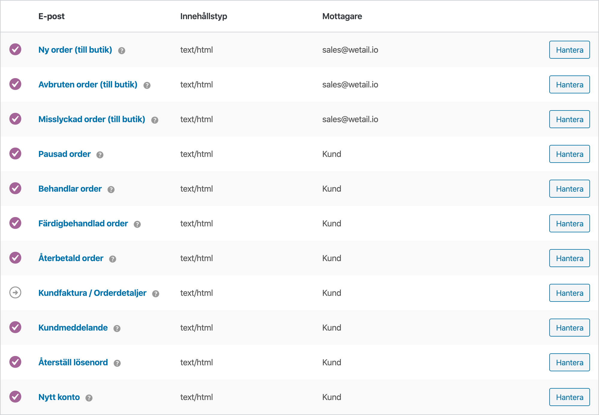 Varje ordernotis är valfri att aktivera eller inaktivera. Man kan även ändra e-postnotisernas ämnesrad eller ändra till ett anpassat meddelande.