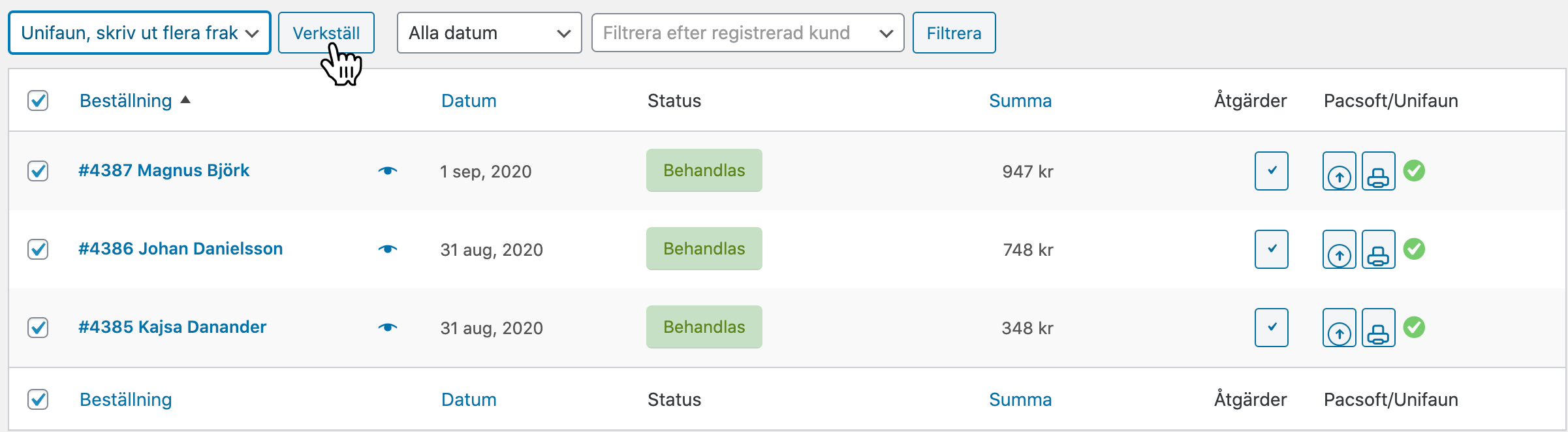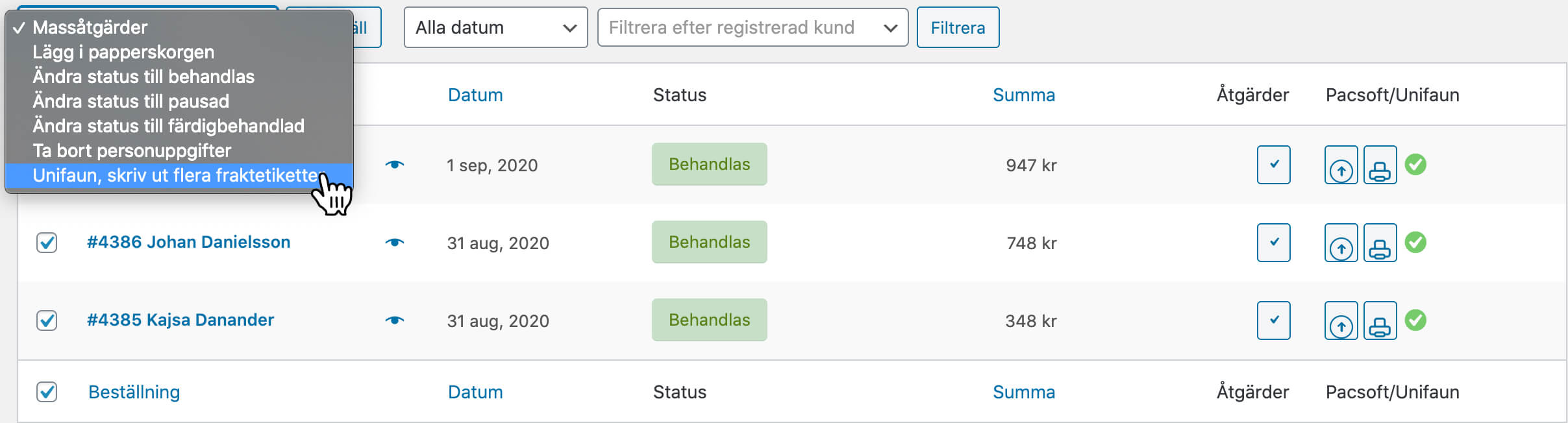 När dina ordrar är synkade med ditt Webb-TA markerar du dina ordrar ute till vänster i orderkolumnen och väljer alternativet Skriv ut flera fraktsedlar