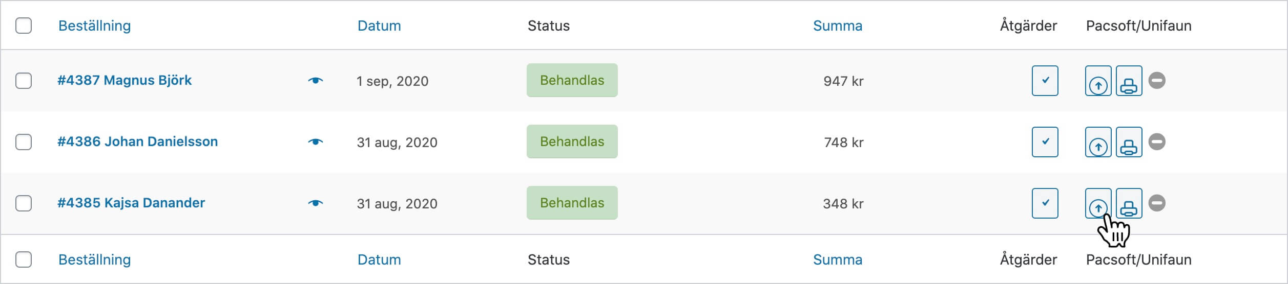 När en order är markerad med en grön ikon är den synkad till Unifaun eller Pacsoft.