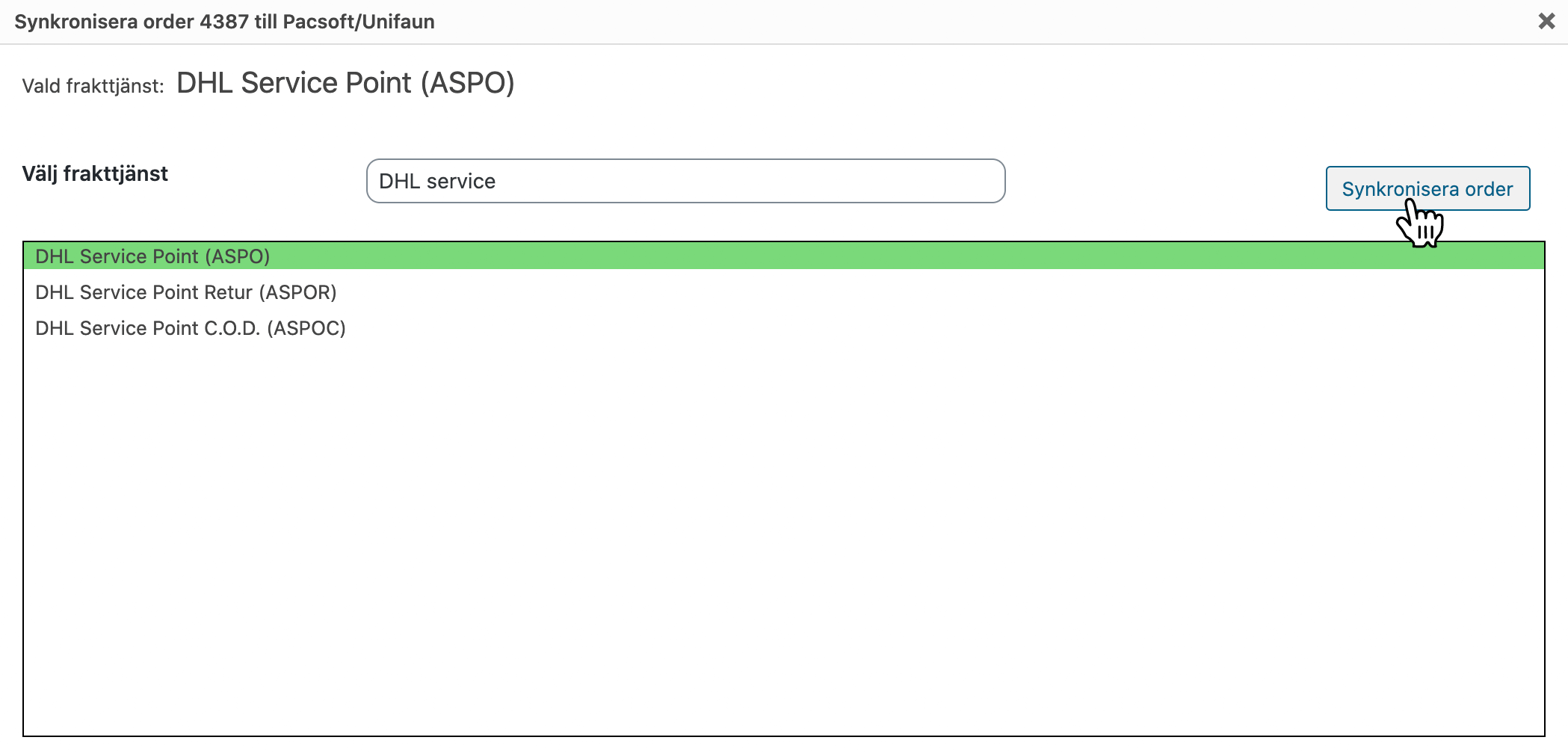 Sök efter rätt fraktval i sökrutan, när du hittat rätt val klickar du på knappen Synkronisera order.