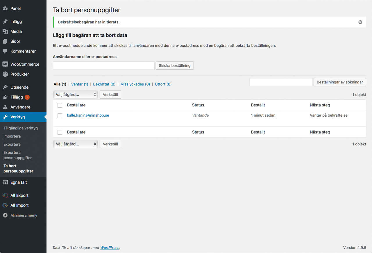 En kund har efter den 25 Maj 2018 rätt att bli bortglömd. Därmed finns det en funktion i WordPress sedan version 4.9.6 som gör det enkelt och tranparent för användare att få kontroll över sin persondata.