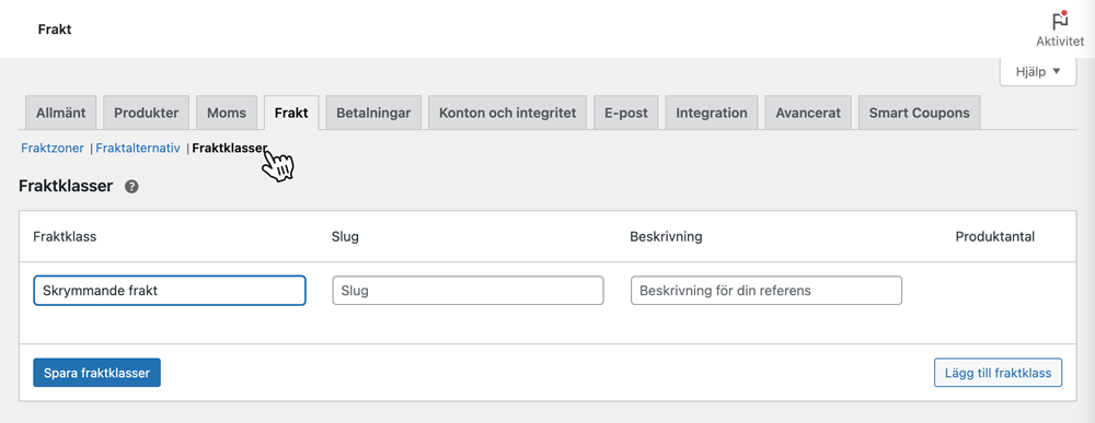 I admin navigerar du till WooCommerce > Inställningar > Frakter > Fraktklasser och lägger till en eller flera fraktklasser