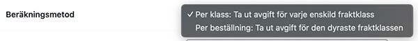 Per klass: Ta ut avgift för varje enskild fraktklassOm en varukorg innehåller artiklar med olika fraktklasser och med olika priser blir fraktpriset de sammanlagda fraktpriserna. Per beställning: Ta ut en avgift för den dyraste fraktklassen