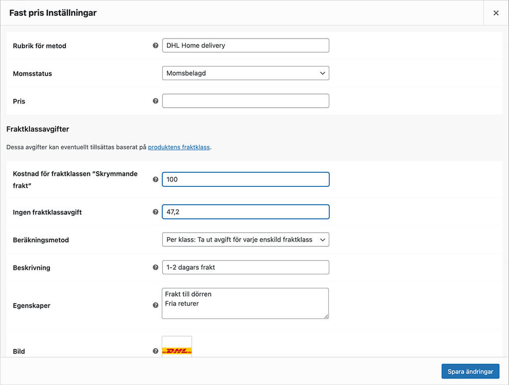 För att ställa in mer avancerade fraktregler kan man använda fraktklasser. Det är lämpligt att använda fraktklasser om du vill ta ut en extra fraktavgift för skrymmande eller tunga varor
