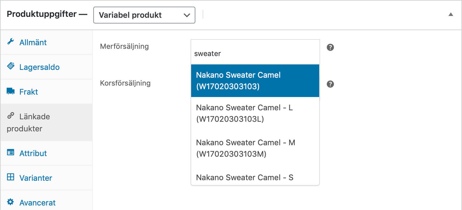 Merförsäljning eller upsales är relaterade produkter som du vill annonsera på produktsidorna. Det kan lämpligtvis användas för att visa en tröja i en annan färg eller en matchande byxa till den aktuella produktsidan besökaren besöker. Har man många artiklar i sin butik så kan man koppla ihop merförsäljingsprodukter med hjälp av en kompleteringsimport.