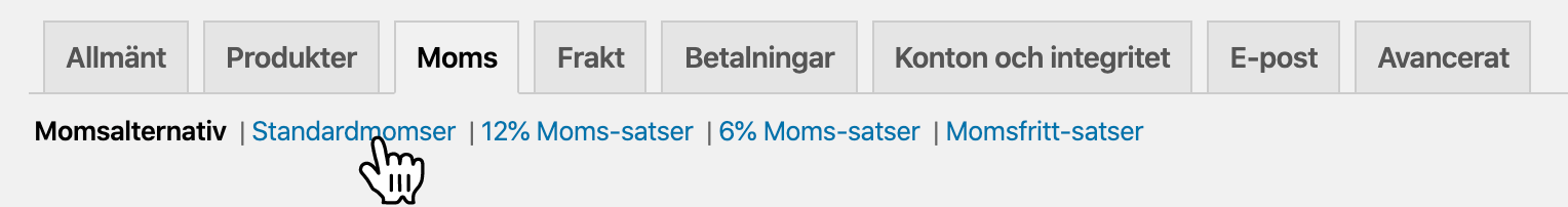 Ställ in sina momsgrupper genom att gå till WooCommerce -> Inställningar -> Moms och välj sedan den momsgrupp du vill redigera genom att klicka på den. I detta exempel ställer vi in 25% moms, men det fungerar på exakt samma vis om du ställer in anpassade momsgrupper som visades i guiden för dina momsinställningar.