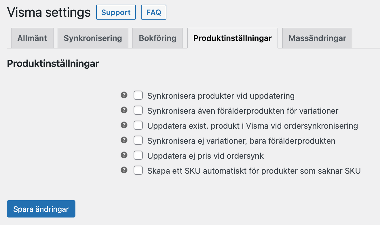 | Synkronisera produkter till Visma | Synkroniserar samtliga produkter i WooCommerce till Visma. |