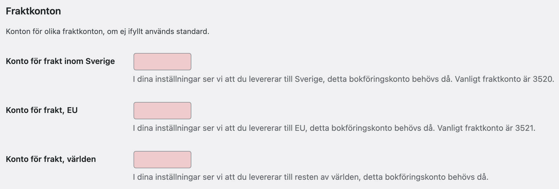 Om du har valt Metod 1 tillkommer en sektion för hantering av frakt. Fyll i aktuella konton för de fraktalternativ som dyker upp.