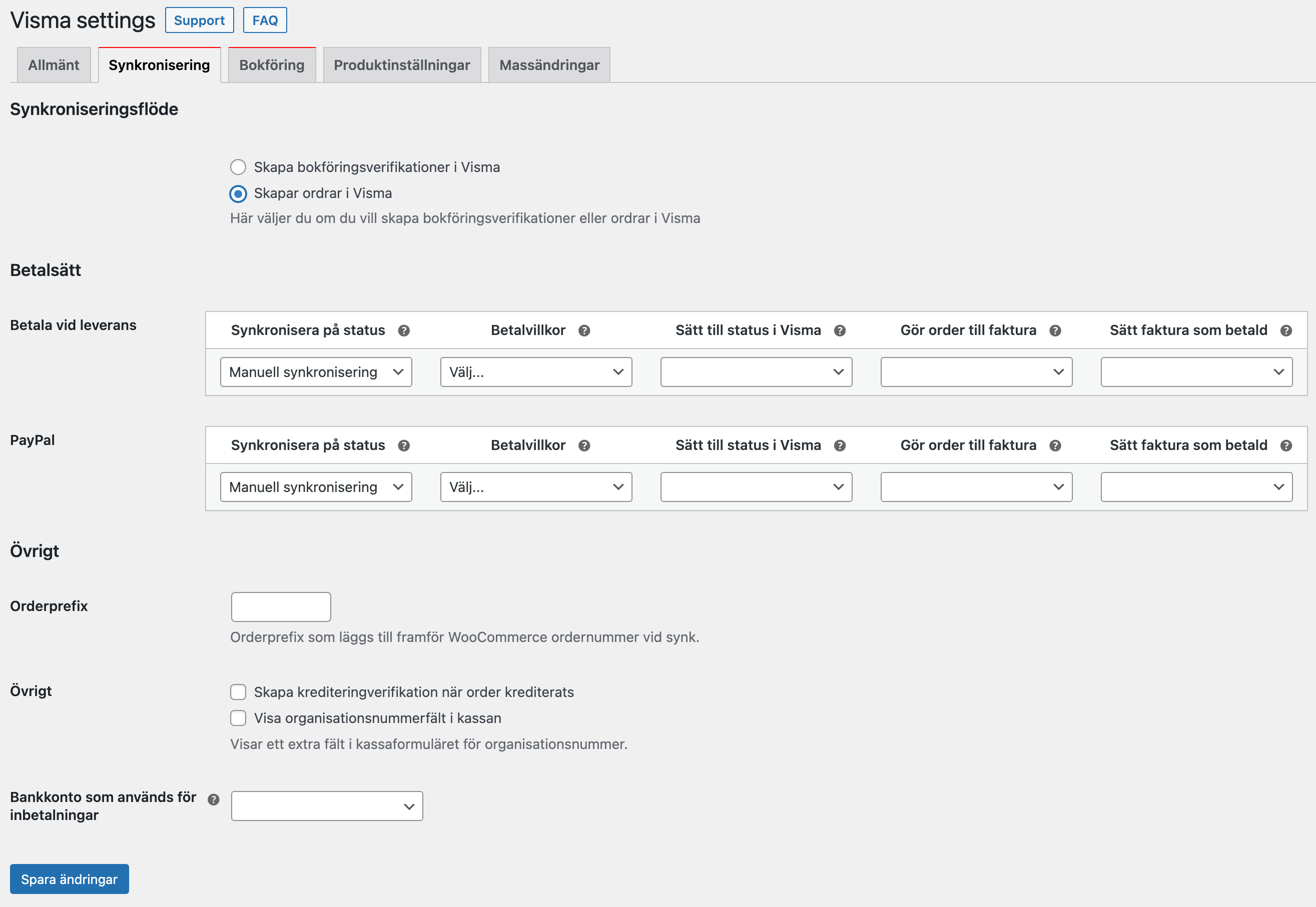 | Orderprefix (endast metod 2) | Det värde du fyller i sätts som offset på dina ordenummeri WooCommerce. Förhindrar att ordernummer krockar med ordrar som skapas i Visma. |