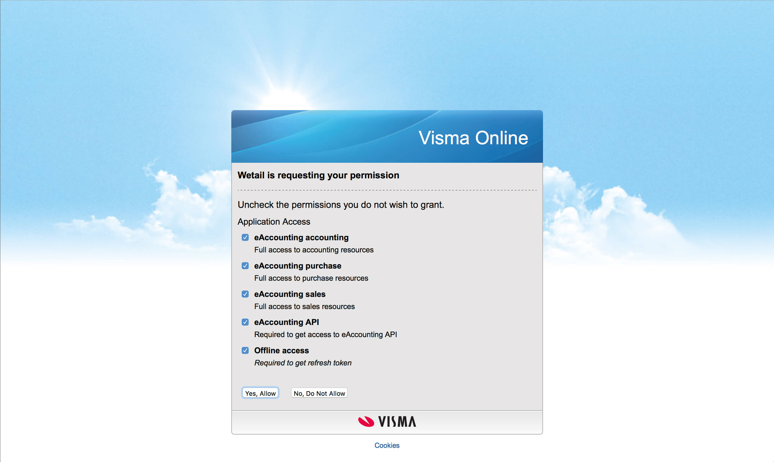 7. Efter det måste du ge kopplingen rättigheter att komma åt data från Visma. Klicka på Yes allow