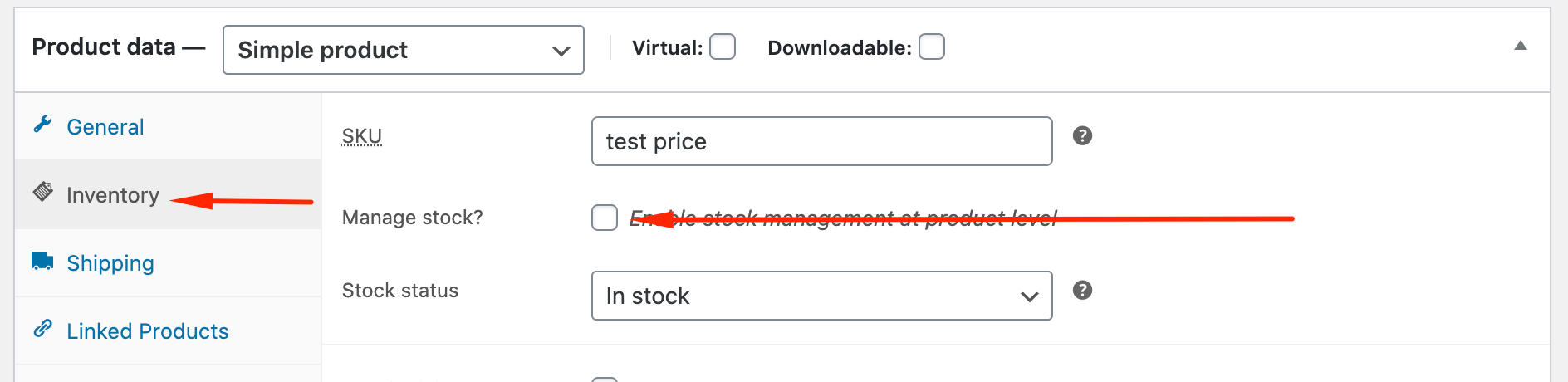 Aktivera lagerhantering för enkel produkt i produktvyn i WooCommerce Backoffice.