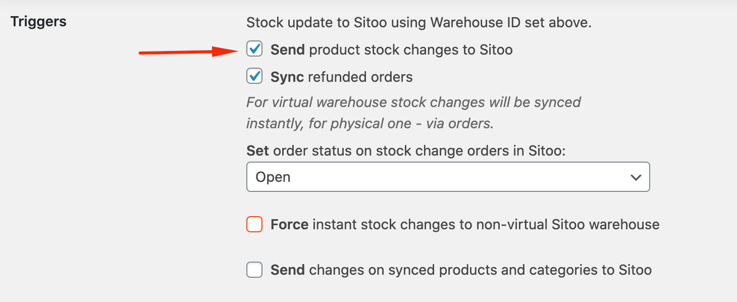 Det ställs in genom att bocka i Send product stock changes to Sitoo i WooCommerce->Settings->Sitoo under rubriken Triggers.