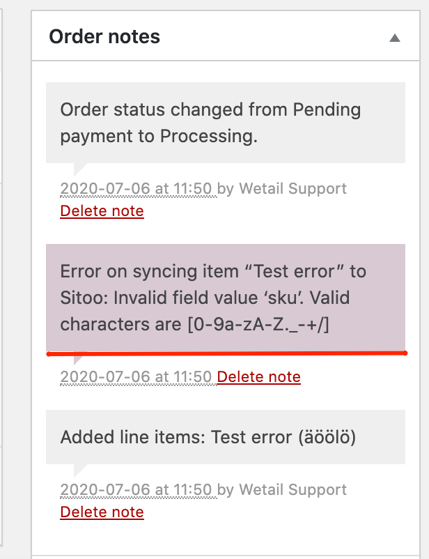 Går man in på ordern i WooCommerce admin får man info om varför den förra synkroniseringen gick fel. Se orderkommentarer till höger i vyn.