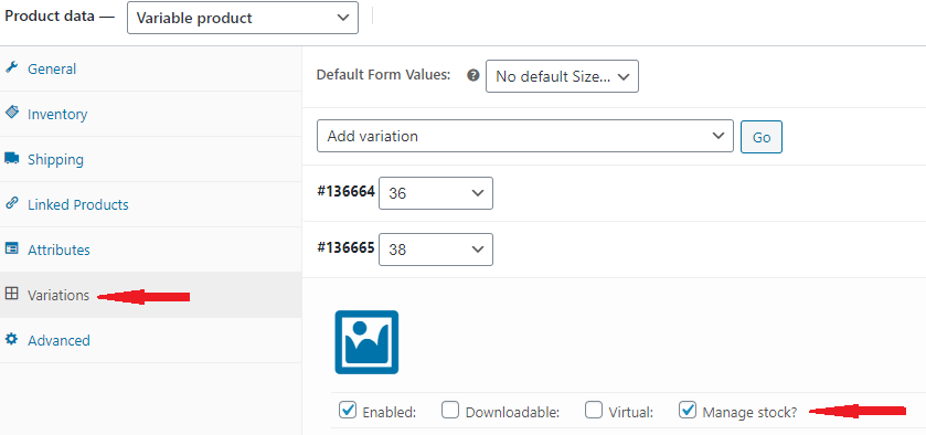 För ”Variable product” krävs endast att ”Manage stock?” är markerad på respektive variant under fliken ”Variations” (se bild).